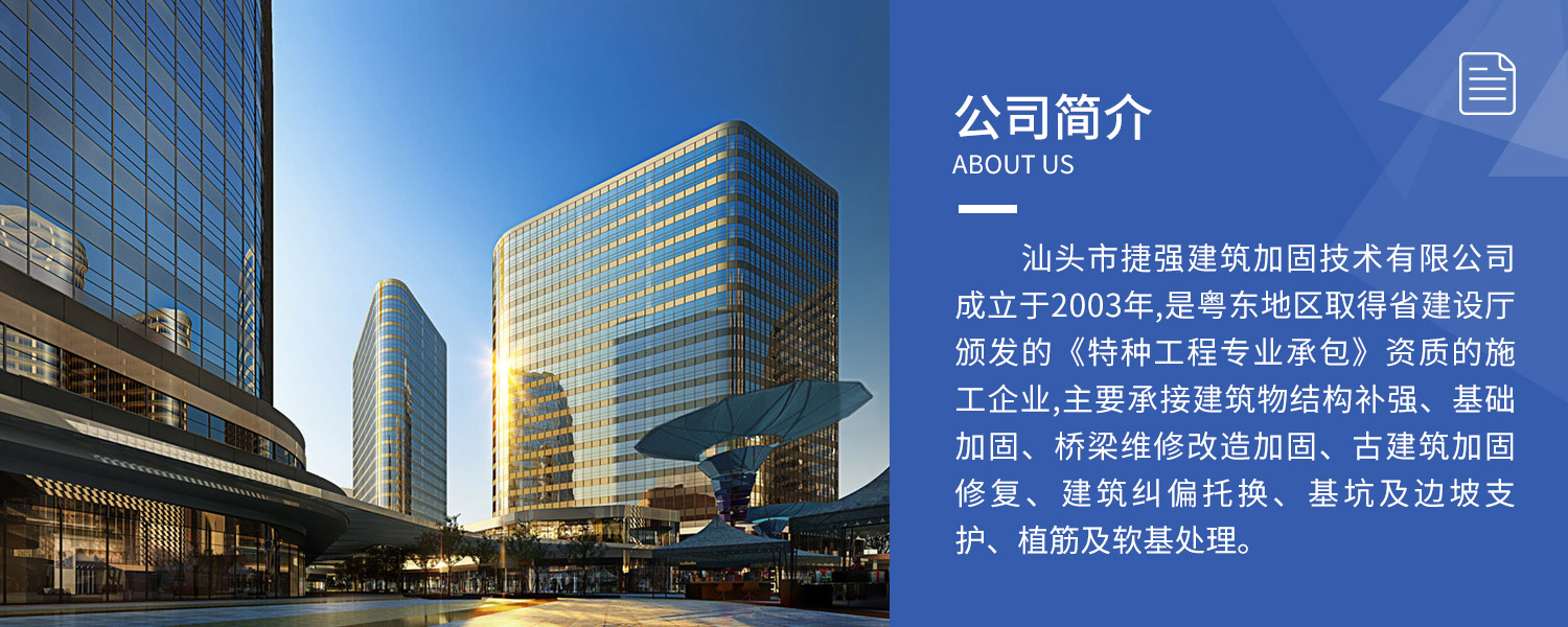 • 汕頭市捷強(qiáng)建筑加固技術(shù)有限公司是粵東地區(qū)取得省建設(shè)廳頒發(fā)的《特種工程專業(yè)承包》資質(zhì)的施工企業(yè)。